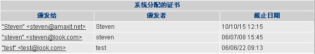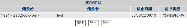 用户可以根据需要来维护自己的证书,收藏其他人的证书以及查看系统分配的证书,这样可以撰写和阅读加密邮件和签名发送的邮件。点击[证书管理]按钮,可以对所有的证书进行管理。 我的证书 创建用户自己的证书,并且可以进行导入、导出管理。