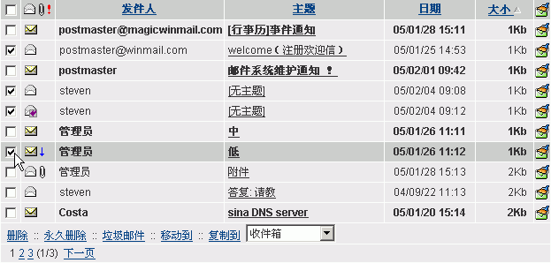 要对邮件进行删除,移动,复制等操作,必须先选择要处理的邮件。用户可以通过点击所要选择邮件前面的 来选择一封或多封邮件。