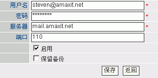 点击按钮,在出现在画面中输入所增加邮箱的POP3服务器名称或IP地址、用户名和密码, 设置是否启用该外部POP3邮箱和是否在POP3服务器上保留邮件备份。最后点击按钮即可。